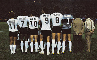 Así, la experiencia de los jugadores y su modelo democrático de gestión, servía para confrontar posiciones: si arriba no podemos votar, vamos a votar nosotros. “Queríamos contribuir a la concientización política del pueblo brasilero”, expresaba Wladimir. Era una lucha directa contra la dictadura. Por eso, también utilizaron su marca como una tribuna de mensajes políticos que colocaban a través de consignas en su camiseta. “El día 15 vote”, en alusión a las elecciones a Gobernador del 15 de noviembre de 1982, fue, por ejemplo, una de las iniciativas en ese sentido.