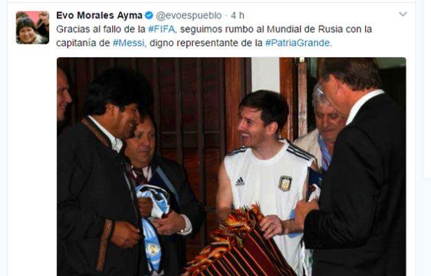 Argentina peleaba la clasificación directamente con Chile y tenía a Messi suspendido por expulsión, sanción que fue levantada. Pero no solo en Argentina fue motivo de festejo esta decisión. “Gracias al fallo de la #FIFA, seguimos rumbo al Mundial de Rusia con la capitanía de #Messi, digno representante de la #PatriaGrande”, escribió otra vez la cuenta de Twitter @evoespueblo acompañado de una foto suya entregándole un poncho a un Messi sonriente.