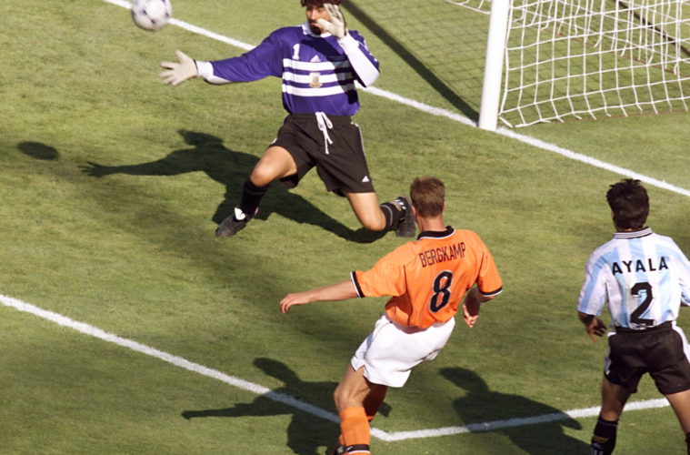 La razón de la eliminación argentina en Francia 98 tiene nombre y apellido: Dennis Bergkamp. Tocó pocas pelotas pero cuando recibió en el área aportó su imaginación al servicio efectivo de las jugadas. Bajó la pelota para el gol de Kluivert y marcó el segundo gol con “una habilidad técnica y disposición mental clínica y minimalista”, como escribe el periodista inglés Jonathan Wilson en su libro Ángeles con caras sucias. La camada de jóvenes que fue construyendo Passarella desde su estadía en River, la base de Atlanta 96 volvía a sufrir una derrota en el final del partido. El gol de Amunike que le dio el oro olímpico a Nigeria fue en el minuto 90, el de Bergkamp en el 89.