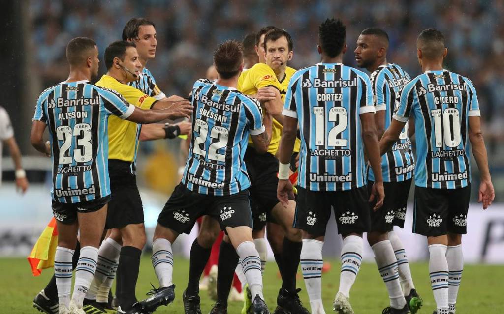 Como si no hubiera problemas, el árbitro le saca amarilla y por ende expulsa (ya había sido amonestado) a Bressan. Hay una marea de jugadores de Gremio que lo rodean. Salta, camina, incluso recibe una agresión física de Bressan, que quiere enterrarse bajo la tierra y no salir nunca más en su vida. Alguno se acuerda de como el VAR que perjudicó a River en 2017 ahora le da una mano. Ya todos se acordaban que el árbitro era el mismo de aquella vez, por todas las puteadas que le dimos hasta que cobró el penal.