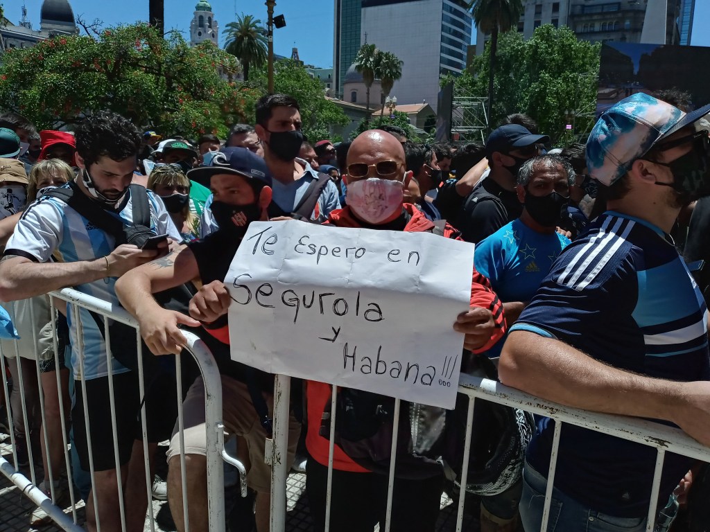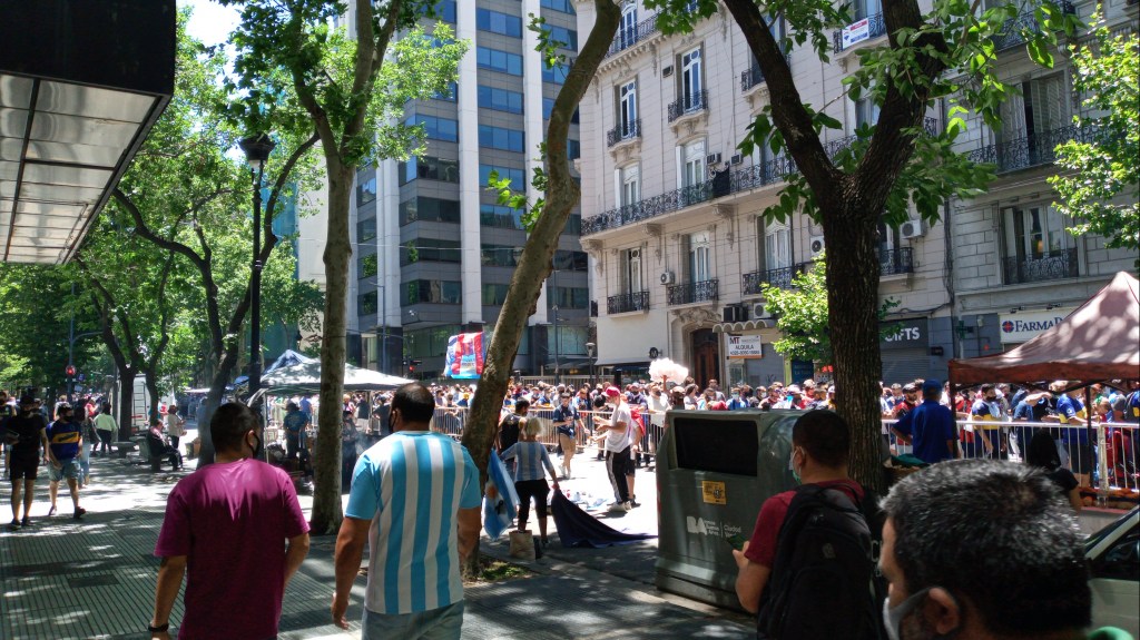 El último tango que dice adiós al dios de los mortales es un desfile de cabezas sollozantes que tenía fin pero no principio. Desde Plaza de Mayo hasta Constitución, con la palabra “distanciamiento” solamente para definir lo que separa un punto del otro de la fila. No paran de llegar corazones de todas las edades y de todos los lugares, para dejar su recuerdo en la última liturgia maradoniana. “No me chamuyes, vos tenés que estar acá porque te gusta el fútbol. Murió el dios del fútbol”, dice un muchacho a su celular en la puerta del banco en una esquina lateral a la Plaza, con una remera de “mi genio amor”.
