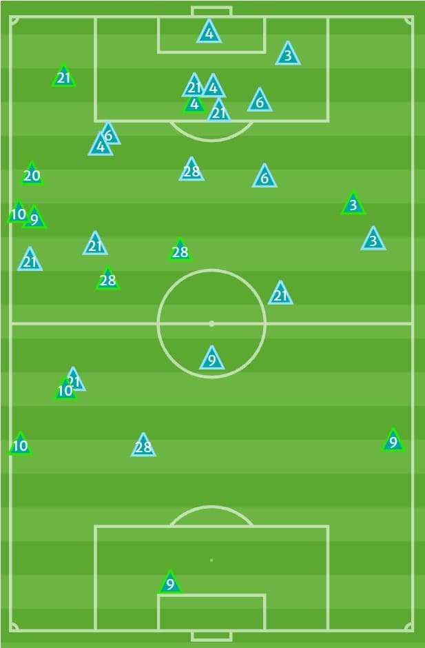 2-Ataque directo. Los dos goles de River mostraron una tendencia al ataque vertical. El primero, buscando rápido a Fontana con un pase largo (de cabeza). El segundo, con un tiro libre cerca de la mitad de la cancha que fue casi teledirigido para una definición perfecta de Julián Álvarez, que se coló detrás de los centrales en modo Batistuta. De hecho, Independiente Santa Fe ganó ampliamente el duelo de posesión de pelota (69,3% a 30.7%). Gallardo entendió que no había condiciones para garantizar una tenencia alta y sí para lastimar en ataques directos contra los centrales (uno de los puntos más flojos del equipo colombiano). Otro dato que ilustra esta situación son los disparos recibidos (22, River; 9, Independiente), lo que expresa que hubo menos ataques de lo normal por parte del conjunto de Nuñez. Pero con mayor eficacia.