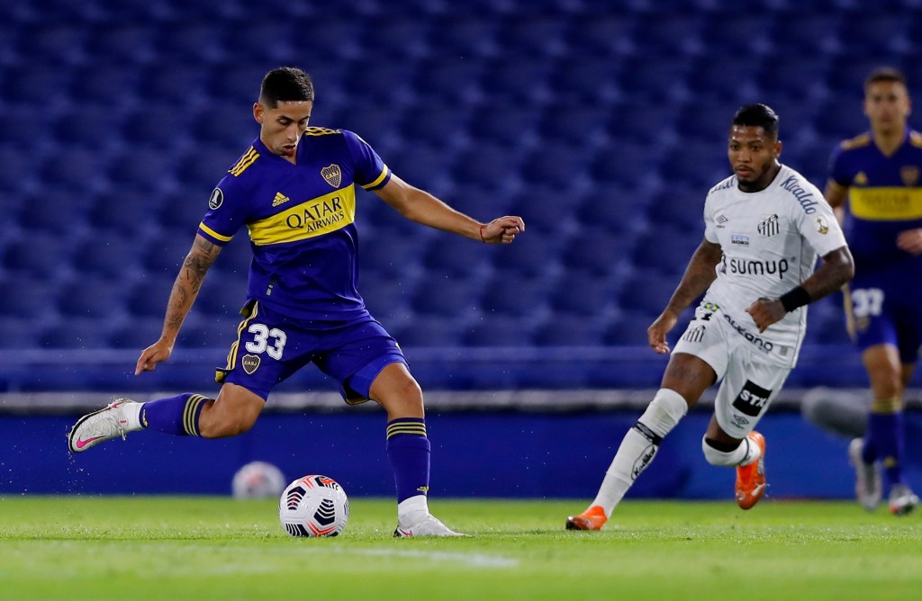 Soccer Football – Copa Libertadores – Group C – Boca Juniors v Santos – Estadio La Bombonera, Buenos Aires, Argentina – April 27, 2021 Boca Juniors’ Alan Varela in action with Santos’ Marinho Pool via REUTERS/Juan Ignacio Roncoroni