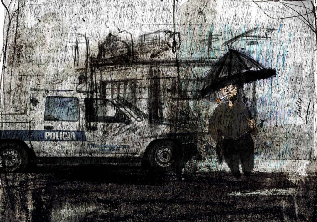 Acerqué las manos al fuego hasta sentirlas y salí al patio para entrar a sacarle una campera al Mosca. Me detuve en seco a los pocos pasos, debajo de la lluvia, y una reacción instintiva me gritó que me quedara ahí para justificar el pelo mojado. Había un patrullero detenido en la puerta, del cual bajaron tres oficiales. Uno golpeó las manos, ubicándome con la mirada luego de hacerse una visera con la mano.
