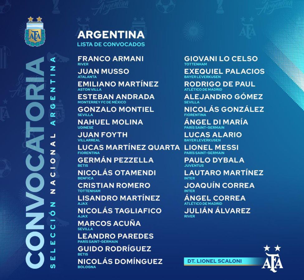 Lista que era la ideal sin lesiones pre Copa América. Vuelve Andrada por Rulli. El ex Lanus pasó de pelear titularidad con Armani a pelear por ser el cuarto arquero. El 1 es Dibu Martínez por sobredosis de personalidad. El suplente Armani por experiencia y partidos jugados en selección. El tercero debe ser un arquero sub 30 de buen presente en Europa. Scaloni elige a Musso de Atalanta. A mí me gusta más Walter Benítez del Niza pero nunca fue llamado.