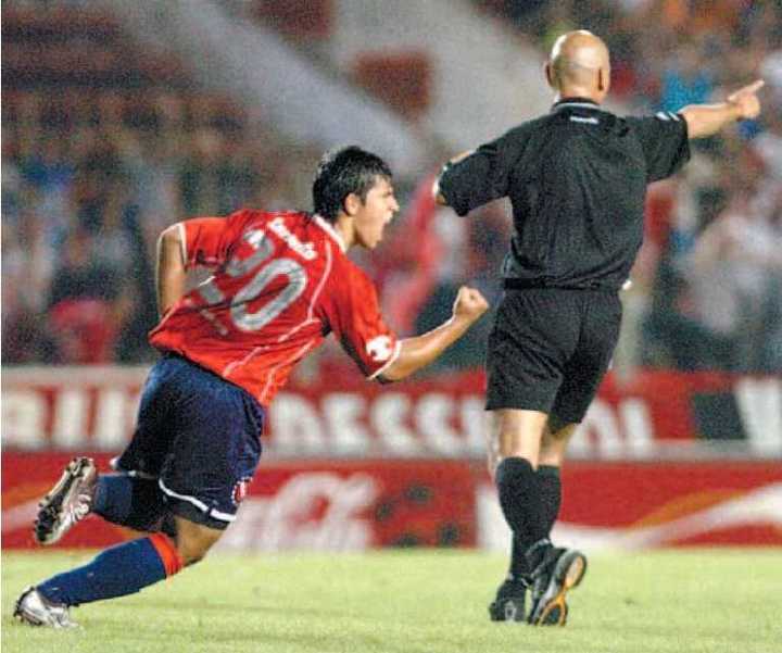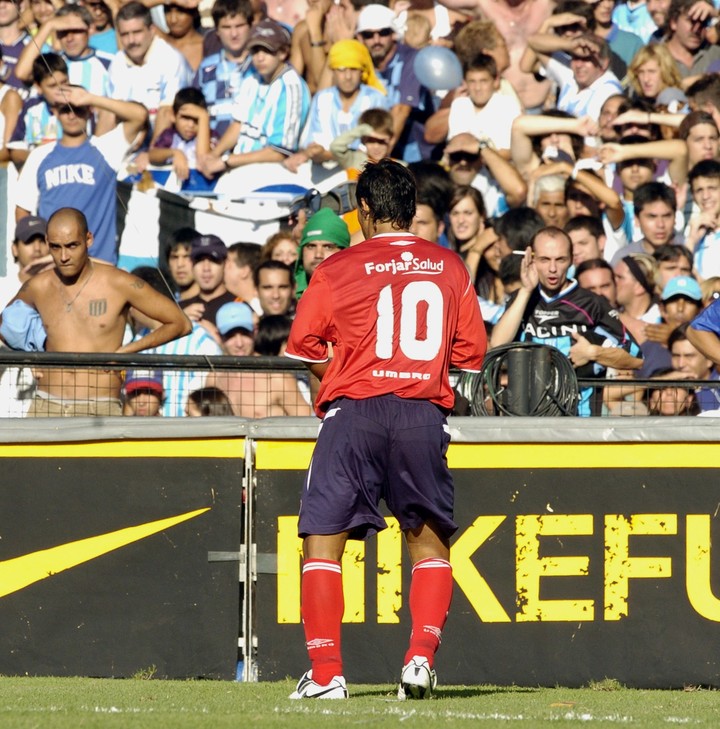 Eran años de camisetas de manga larga, las tarjetas redondas de Ángel Sánchez, Fútbol de Primera, TyC Max, tocones, bengalas y, claro, hinchas visitantes. Ese primer gol lo hizo en la Doble Visera, de cara a la hinchada de Independiente. Como diciendo: «Hola ¿Qué tal? ¿Vamo a juga?».