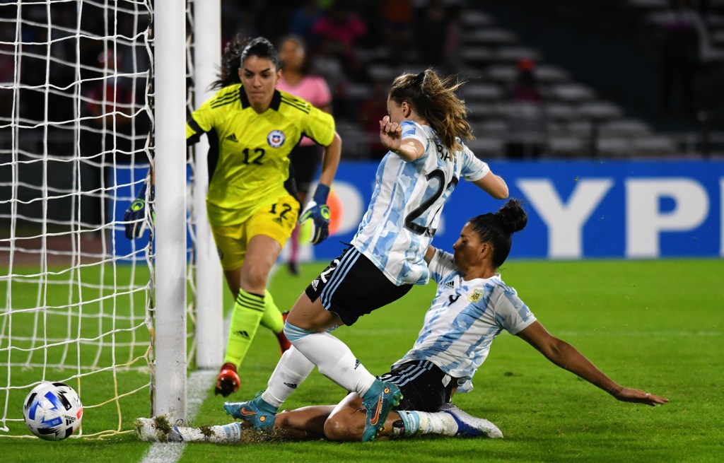 Parece el juego de “El piso es lava”. La línea que tiene delante marca que ahí no se puede pisar. Que no hay ansiedad, ni nervios, ni ganas de gritar que valgan. Hay que esperar. Si espero casi tres años, como no va a aguantar un par de segundos hasta Jaimes patee y así poder descargarse. Tres minutos pasaron desde que arrancó el partido. Recibió por izquierda. Habilitó. Volvió a pedir la pelota. Juntó una, dos, tres y descargó. Medio sucio, pero descargó al fin. Y en el barullo de las piernas una mano. La referee que cobra penal. Y acá está. Esperando que vuelva a sonar el silbato. Del otro lado de una línea imaginaria que divide lo que sí y lo que no. Ella está más a la izquierda que todas. Suena el silbato. La delantera y la arquera chilena eligen el mismo palo. La mayoría mira. Ella ya está adentro del área cuando la pelota rebota en los aguantes de la arquera. Viene hacia ella. Pero a veces las ganas complican todo: un arrebato de Jaimes por enmendar el penal errado termina en saque de arco.