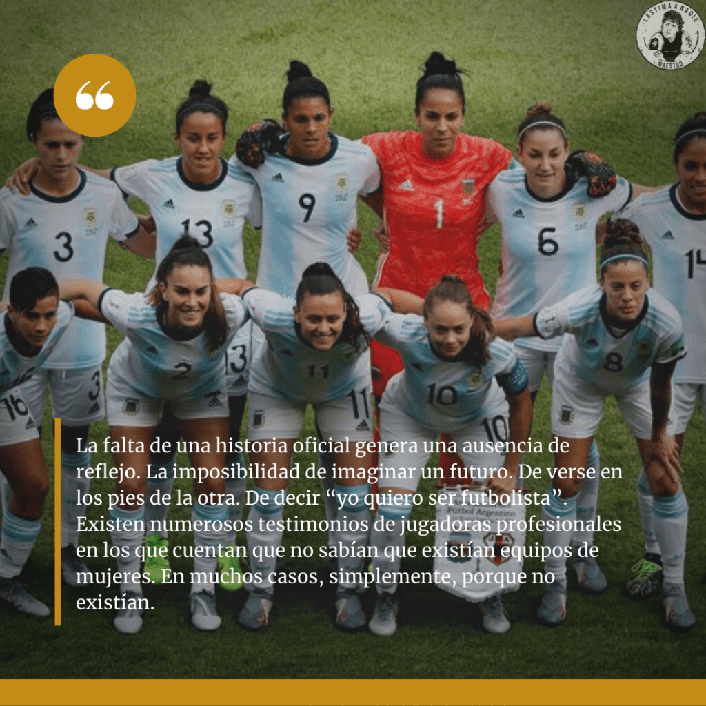 La falta de una historia oficial genera una ausencia de reflejo. La imposibilidad de imaginar un futuro. De verse en los pies de la otra. De decir “yo quiero ser futbolista”. Existen numerosos testimonios de jugadoras profesionales en los que cuentan que no sabían que existían equipos de mujeres. En muchos casos, simplemente, porque no existían.