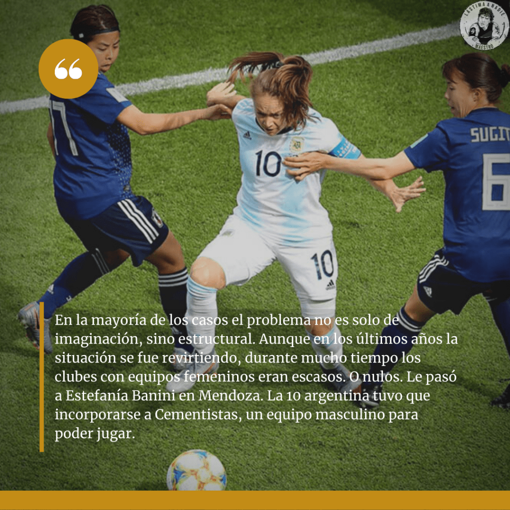 En la mayoría de los casos el problema no es solo de imaginación, sino estructural. Aunque en los últimos años la situación se fue revirtiendo, durante mucho tiempo los clubes con equipos femeninos eran escasos. O nulos. Le pasó a Estefanía Banini en Mendoza. La 10 argentina tuvo que incorporarse a Cementistas, un equipo masculino para poder jugar. Pero los organizadores del torneo, sumado a los padres y las madres de los niños de otros equipos, intentaron negarle la posibilidad de jugar. La mamá y el papá de Banini tuvieron que firmar un documento donde se hacían cargo de lo que le pasara a su hija en la cancha. Ella solo quería jugar a la pelota.