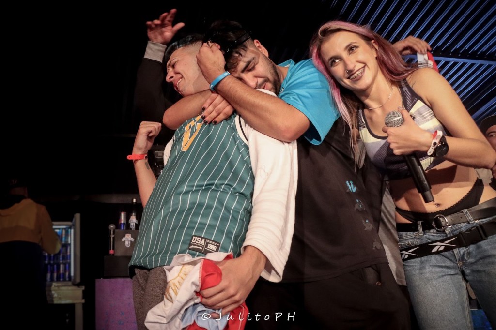Dos personas se abrazan en el escenario. Se abrazan después de tirarse con de todo: que si sos del barrio, que si te gusta la fama, que si te conoce alguien o sos un don nadie, si te equivocaste mientras estabas tirando líneas, si tenés sponsors o venis bien de abajo, que si haces rap o lo tuyo es stand up. Es que se puede hacer reir mientras se rapea y también podes hablar de Van Gogh, de Urquiza y Mitre, de la devaluación, del patriarcado, del complejo de Edipo, de quién maneja el patrullero o tiene fama por colgarse de los huevos de otro.