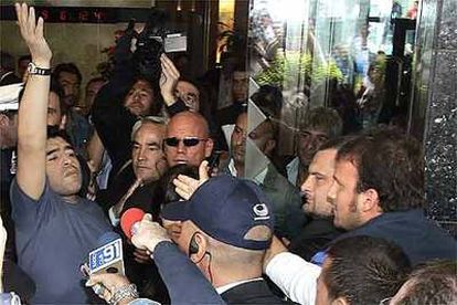 Mientras su Napoli luchaba por ascender a la Serie B Maradona se reencontraba en el hotel con el ex propietario del club Corrado Ferlaino. Al apretón de manos le siguió un abrazo y una charla. Fueron presidente y figura de los años dorados del club con dos títulos de Liga, una Supercopa Italiana, una Copa de la UEFA y una Copa de Italia. La relación entre los dos se rompió en 1990 y terminó de la peor manera con acusaciones cruzadas tras la ida del 10. No solo Ferlaino fue al hotel, mucha gente se amontonó en la calle para ver a Maradona, que se asomó de una ventana a saludar y también salió a la puerta a certificar la locura que generaba su presencia en la ciudad.