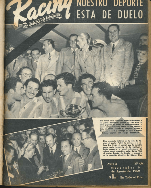 La foto del instante en el que Paillot le entregó a Evita su carnet de socia honoraria ilustra la tapa de la Revista Racing posterior al fallecimiento que enlutó a la Argentina. Evita, nacida el 7 de mayo de 1919 en la localidad bonaerense de Los Toldos, asoma en la imagen concentrada en el carnet, con el pelo peinado hacia atrás, una pulsera en la muñeca derecha y un vestido negro. Paillot sonríe para la cámara como si supiera que está delante de un momento que quedará para la posteridad. Carlos Aloé, gobernador de la Provincia de Buenos Aires e hincha de Racing, y Cereijo lo secundan. Las páginas 12 y 13 de ese número del semanario -el 474- tienen un título que no admite dobles lecturas: “El pueblo le expresó su adoración”. No fue esa ni la primera ni la última manifestación en clave peronista de la revista que vio la luz en 1943. El 22 de junio de 1955, apenas seis días después de los salvajes bombardeos sobre Plaza de Mayo, se pronunció sobre el intento golpista: “La revista RACING, que se siente parte integrante de una expresión popular, hace una pausa en su trayectoria para condenar, con el más profundo de los dolores, el acto de barbarie cometido por quienes quebraron la paz de la familia argentina, bajo el sino trágico de la muerte desparramada desde el cielo”.