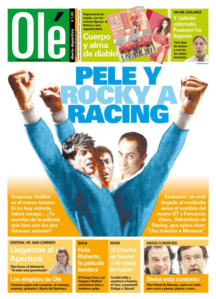 A fines del mes pasado se cumplieron nada menos que veinte años de la renuncia de Mostaza Merlo a la dirección técnica de Racing Club y de la contratación, contra toda previsión y en reemplazo de quien con el Apertura 2001 había cortado una sequía de treinta y cinco años en materia de títulos de primera división, de Osvaldo Ardiles. El Pitón era un ex campeón del mundo con la Selección argentina en 1978. Además en 1981, como lo recordó Olé en la tapa en que anunciaba su llegada, había protagonizado el film Escape a la victoria con Pelé, el polaco Deyna y Bobby Moore, pero también con Sylvester Stallone, Michael Caine y Max von Sydow.