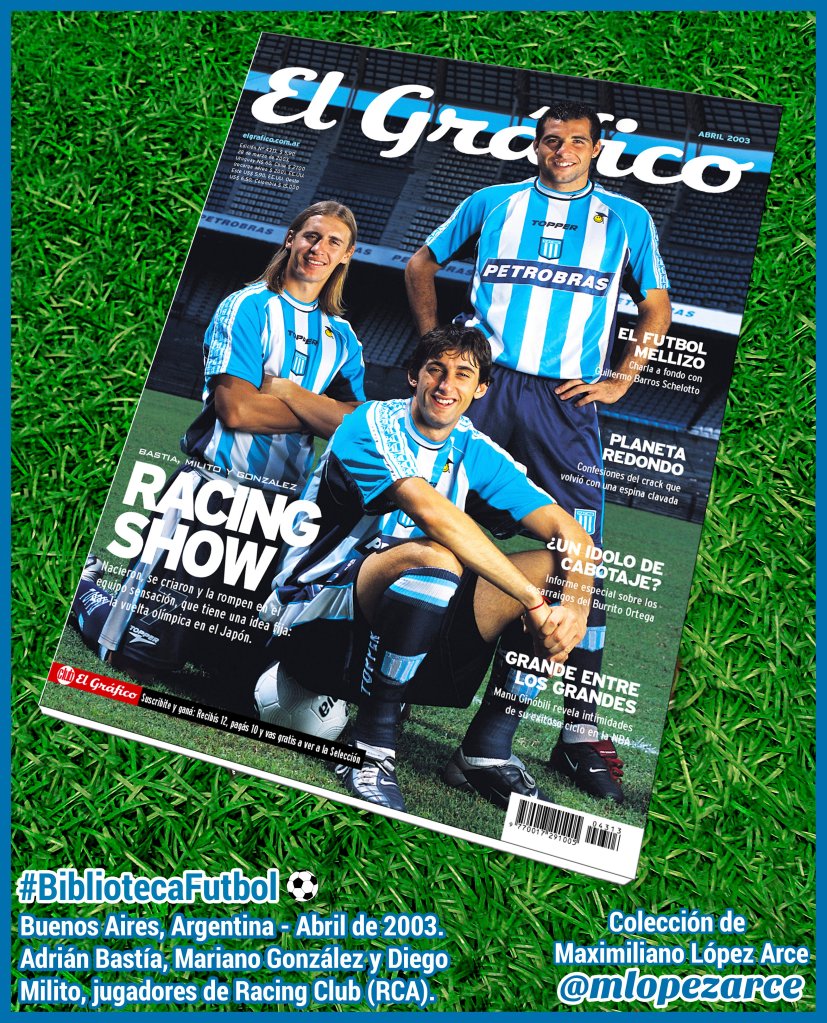 No estuvo mucho tiempo el Pitón en Racing. En 2003, la Academia jugó la Copa Libertadores. Empezó como los dioses, ganando su grupo y metiéndole cuatro a Nacional de Uruguay en Avellaneda. “De la mano de Merlo salimos campeón; con Ardiles, no paramo’ hasta Japón”, cantaban los hinchas del club. En abril, el ya para entonces mensuario El Gráfico hizo la tapa con Racing y con tres de sus jugadores (el Polaco Bastía, Diego Milito y Mariano González) posando para la foto en el Juan Domingo Perón. Las cosas no terminaron bien, sin embargo.