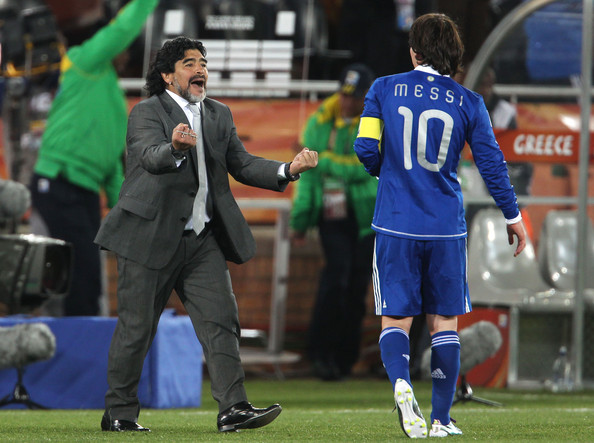 El 22 de junio del 2010, dos días antes de su cumpleaños, Argentina ya clasificada cerraba su participación en el grupo contra Grecia. La idea era poner un equipo alternativo pero mantener al arquero Romero, un referente de la defensa Demichelis y a Messi, para que pueda meter su primer gol en el mundial después de que los arqueros de Nigeria y Corea del Sur le saquen goles de los ángulos. Pero Maradona además le daría la cinta de capitán por primera vez.