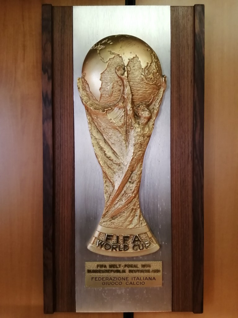El 5 de abril de 1971 una comisión especialmente constituida para seleccionar a uno de los 53 diseños presentados elige el trabajo de Gazzaniga: dos atletas que sostienen en sus brazos un globo terráqueo. Una imagen atractiva para la televisión. Compuesta por 5 kilos de oro de 18 kilates (que significan poco más del 80 por ciento del peso total), se la verá por primera vez tres años después. Franz Beckenbauer, capitán del seleccionado alemán, la levantará ante su público luego de la victoria frente a la Holanda de Johan Cruyff. De aquel momento en adelante se convertirá en símbolo de los mundiales.