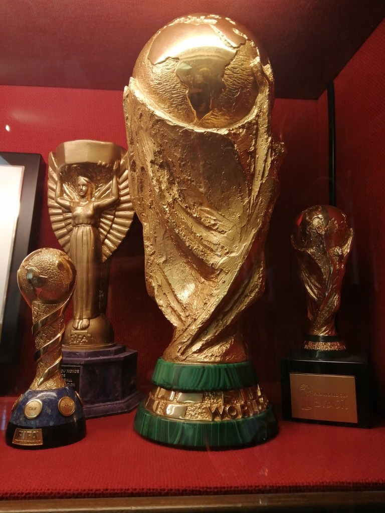 Al ingresar a la sala iluminada desde los cuatro costados nuestros ojos son acribillados por imágenes que quedarán grabadas en las retinas. Se pierden en varios de los trofeos más famosos del deporte. Y buscan al más importante del planeta-fútbol. Todos lo vimos alguna vez por tele luego de cada final; pero casi nadie estuvo remotamente cerca de donde lo crearon.