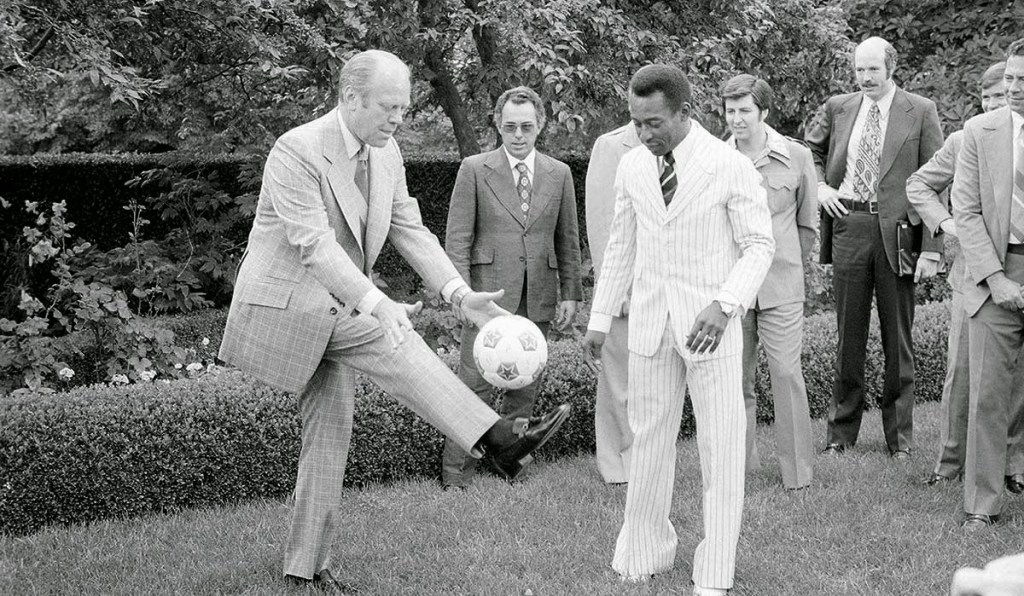 Pelé conoció al presidente de Estados Unidos antes de salir campeón de la North American Soccer League, el precuela de la Major League Soccer. Fue a los pocos días de haber firmado contrato con el Cosmos, vestido de saco, pantalones y zapatos blancos, Pelé hizo jueguitos con una pelota en el patio de la Casa Blanca. Intentó enseñarle al presidente de Estados Unidos, Gerald Ford, a mantener la pelota en el aire con el pie, pero no tuvo éxito. “Puedo hacerlo con la mano”, le dijo Ford. Pelé y los periodistas presentes celebraron el chiste del presidente. Gerald Ford es recordado por ser el sucesor de Richard Nixon y por el fin de la guerra de Vietnam. El encuentro fue el 25 de junio de 1975, antes tuvieron una reunión de 10 minutos en el Salón Oval de la Casa Blanca. La reunión, privada, fue grabada por los micrófonos de la CIA. No era la primera foto de Pelé con un presidente, ya se había sacado con Garrastazu Médici, dictador de Brasil, sosteniendo la Copa del Mundo.