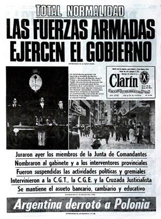 La primera tapa de Clarín durante el Golpe Militar tituló: “Total normalidad. Las Fuerzas Armadas ejercen el gobierno. Argentina le ganó a Polonia”. La tele y la radio cortaban la transmisión en la madrugada -excepto esa noche- y los diarios publicaban a la mañana las noticias de la jornada anterior. Un día antes del derrocamiento de Isabel, el 23 de marzo de 1976, La Razón había titulado: “Es inminente el final”. Ese día, River jugaba por Copa Libertadores en El Monumental y, unas dos horas después, pasada la medianoche del 24, las FFAA derrocaron a Isabel, capturándola en helicóptero desde Plaza de Mayo. A la vez, un grupo de mujeres manifestantes cantaban: “Seguí luchando, Isabel, seguí luchando; seguí luchando que te vamo a respaldar”.